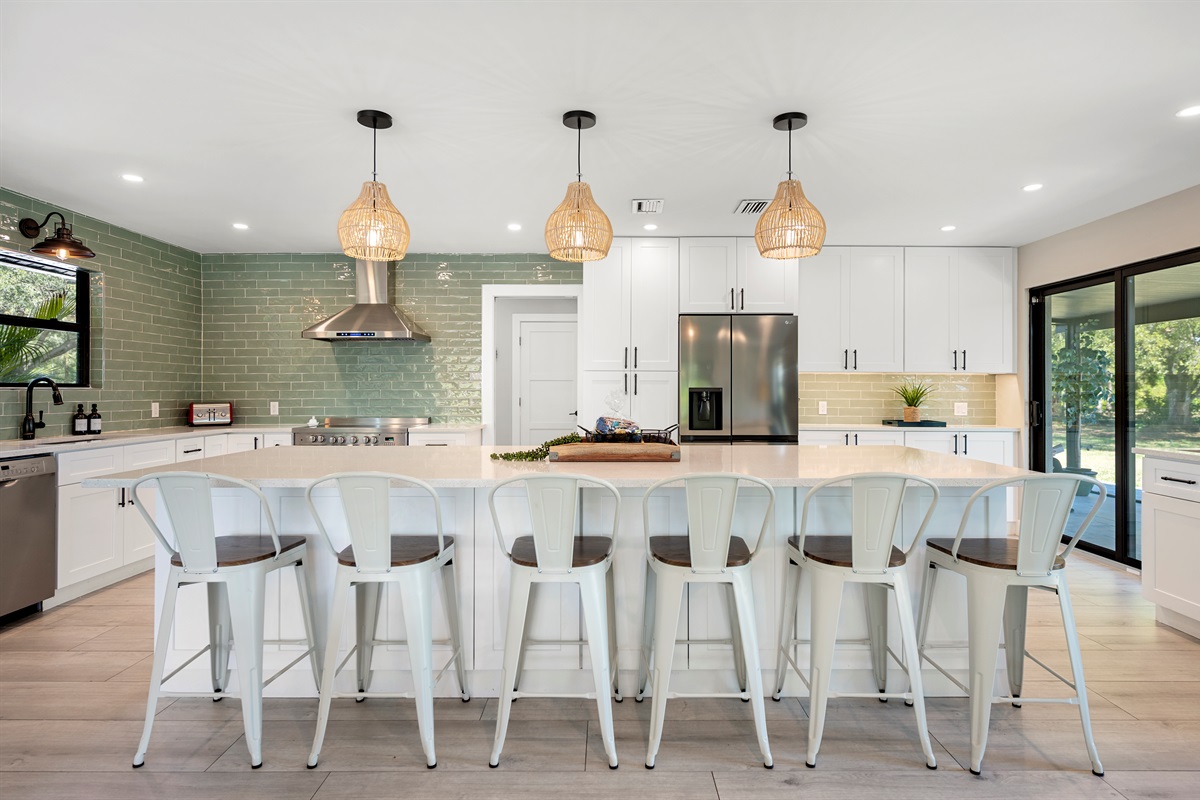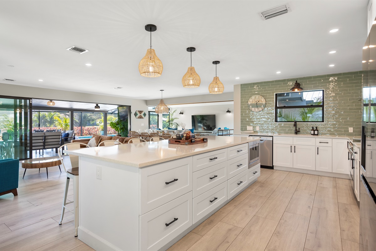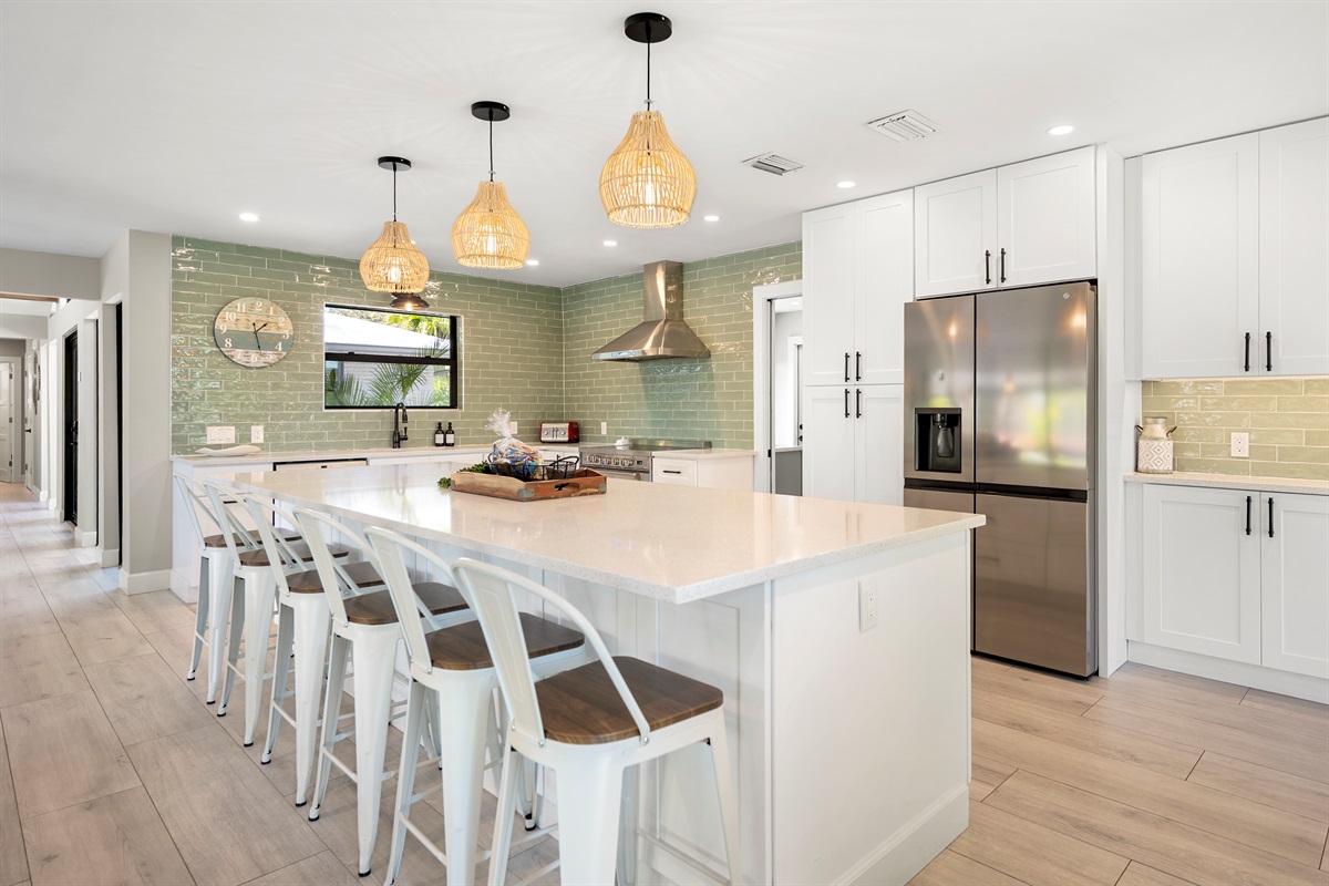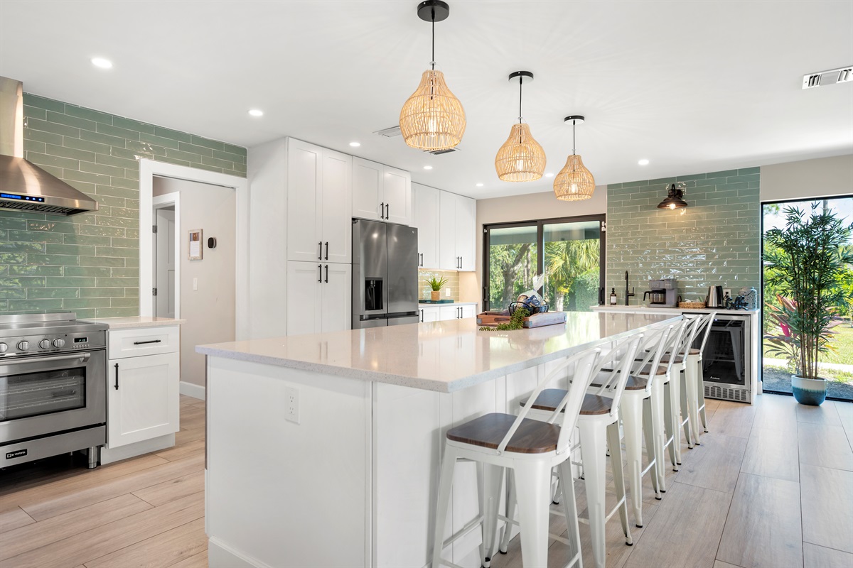 It is fully equipped with modern cooking appliances that make it suitable for preparing any meal, whether it is a simple breakfast, quick snack, or a three-course gourmet dinner. Spacious quartz countertops extend into a kitchen bar and provide plenty of room for you to work your master chef magic.