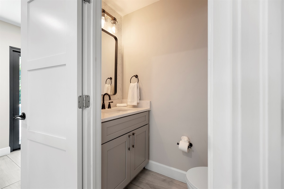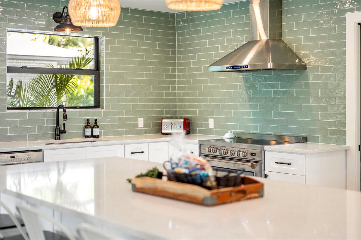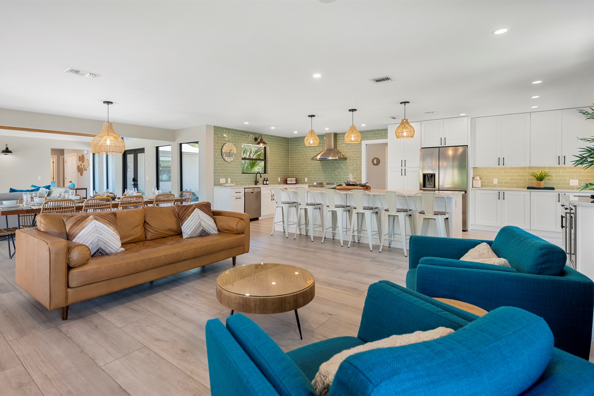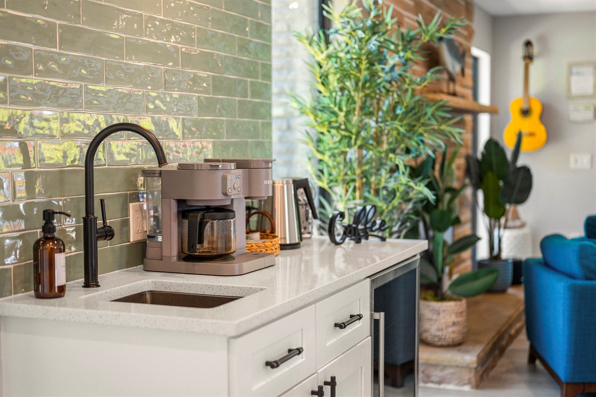 It is fully equipped with modern cooking appliances that make it suitable for preparing any meal, whether it is a simple breakfast, quick snack, or a three-course gourmet dinner. Spacious quartz countertops extend into a kitchen bar and provide plenty of room for you to work your master chef magic.