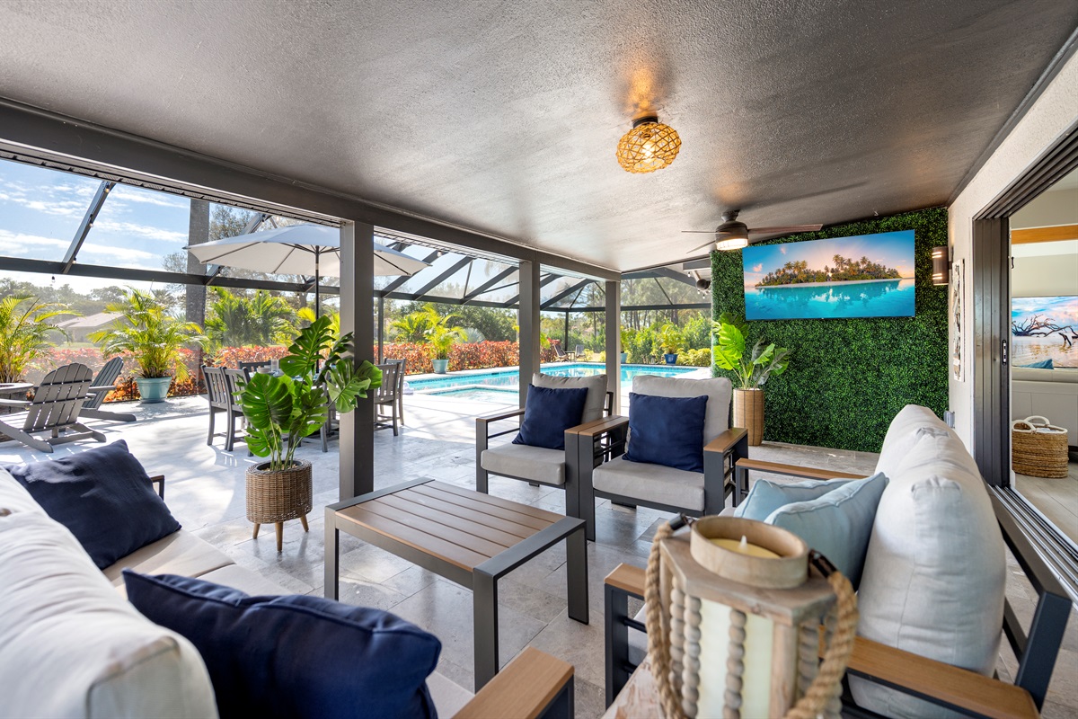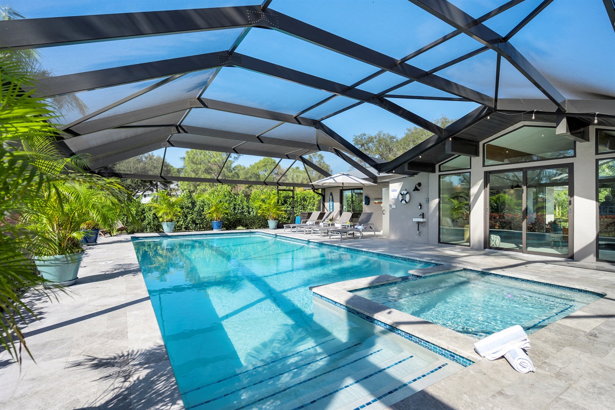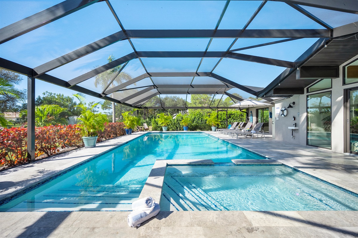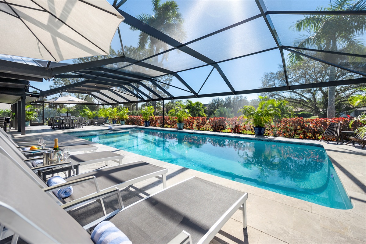As soon as you step foot in the luxury pool villa, you're welcomed by a very stylish yet highly comfortable open-plan living area. It is designed and decorated in an elegant coastal manner that compliments the breathtaking vacation setting of Naples, FL! The fully equipped kitchen and two dining areas open onto the entertaining living room, setting the tone for many memorable evenings. Plenty of natural light coming through the large windows and doors makes the whole villa very bright during the entire day. Retreat to four comfortable bedrooms, which feature 5☆-resort comforts that allow you to rest after an exciting day of adventuring throughout Naples. But wait! The best is yet to come! Step outside to the spacious and enclosed pool area equipped with luxury amenities for ultimate relaxation.